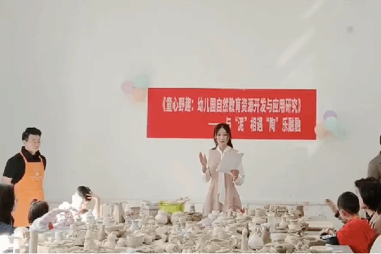 主持人:“小朋友,现在是什么季节?”幼儿:“春天”。主持人:“春天有哪些特点呢?”幼儿:“遍地花开”“万物复苏”。主持人:“春天是冰雪消融、万物复苏的季节。春耕、夏耘、秋收、冬藏。春天还是播种的季节,我们人类的生活离不开大地,大地不仅孕育了生命,还为我们的生活和创作提供很多资源,比如泥土。陶艺传递着中国独特的审美艺术特点与创造智慧。春天,让我们一起走进大自然,一起亲密接触大地馈赠于我们的泥土,今天我们的活动主题是与‘泥’相遇 ‘陶’乐融融。”